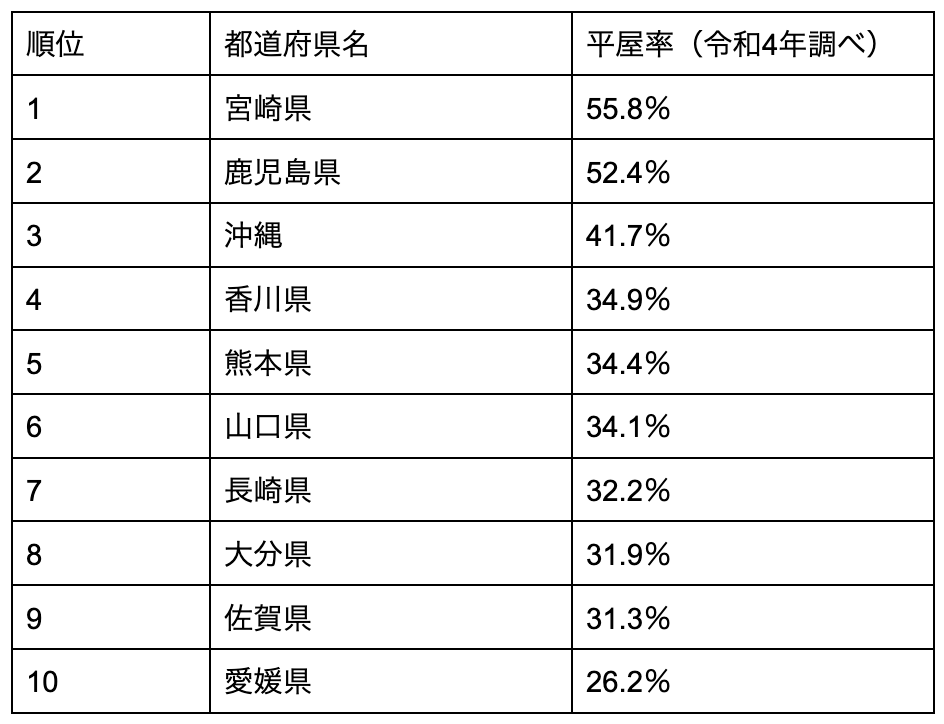 岩手県の平屋事情を確認する前に、平屋の多い都道府県ランキングを確認してみましょう。国土交通省が発表している建築着工統計調査によると、平屋の多い都道府県ランキングは以下のような結果となりました。