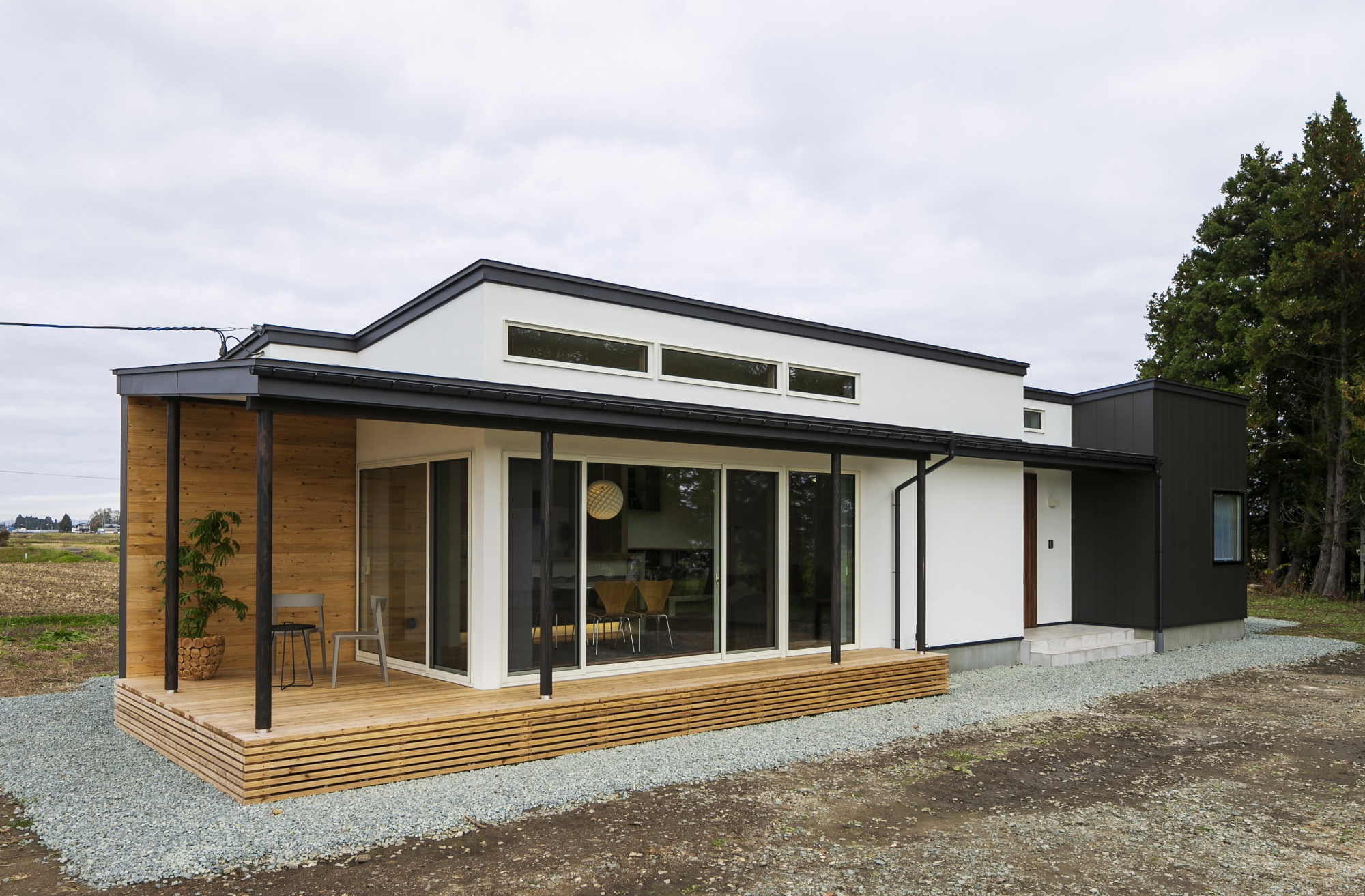 緑豊かな田園風景に囲まれ、白い塗り壁の映える平屋。玄関を中心に西側にLDK、東側に水回りや主寝室、中央に子ども部屋を配置し、南側の大開口や高窓からの陽光に包まれるLDKは勾配天井でより開放的に感じられます。どの部屋からものどかな景色を望みつつ、ワンフロアで将来まで安心して暮らせる住まいです。