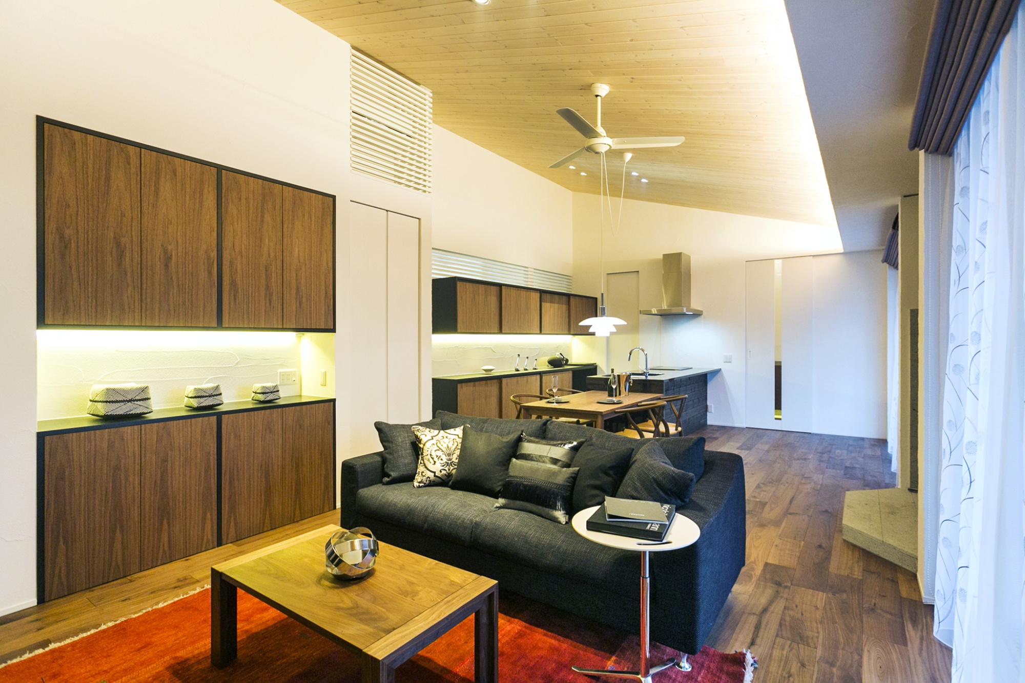 リビングは、木のぬくもりあふれる勾配天井で開放感がありながら、暖かい雰囲気を演出した和モダンな平屋です。