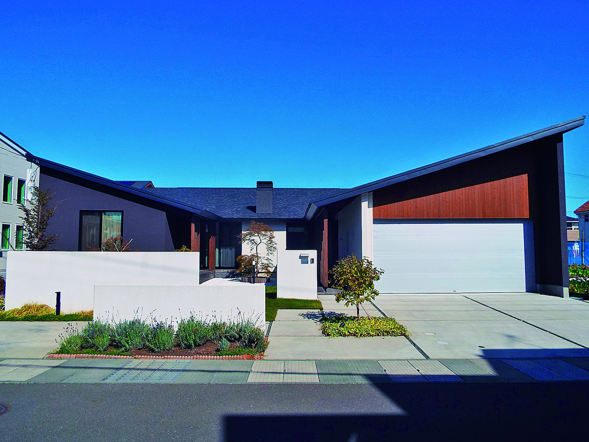 ガレージと棟続きに住戸を配した、この字型の平屋。奥には玄関を配置しプライバシーに配慮。通りから家の中が見えないように軒を深くし敷地中央に植栽を植えた中庭が印象的な外観。